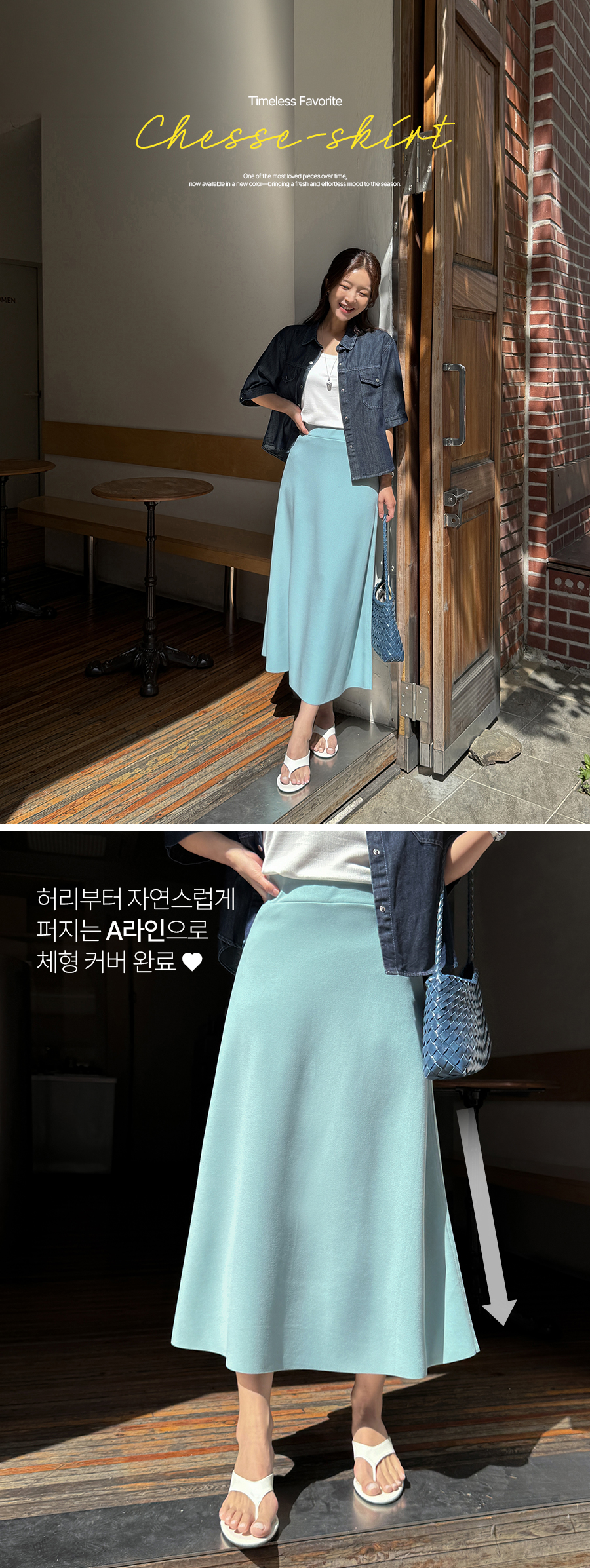 허리에서 자연스럽게 퍼지는 A라인으로 우아한 무드