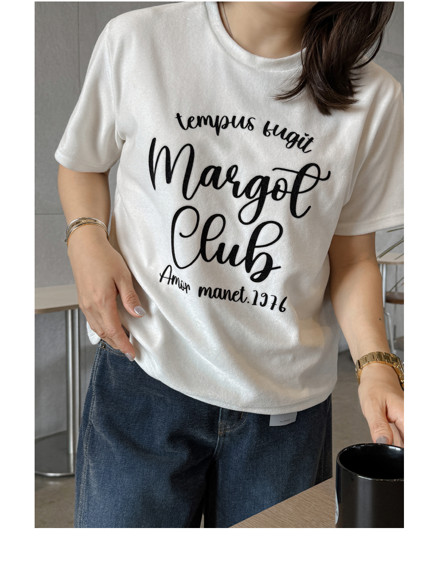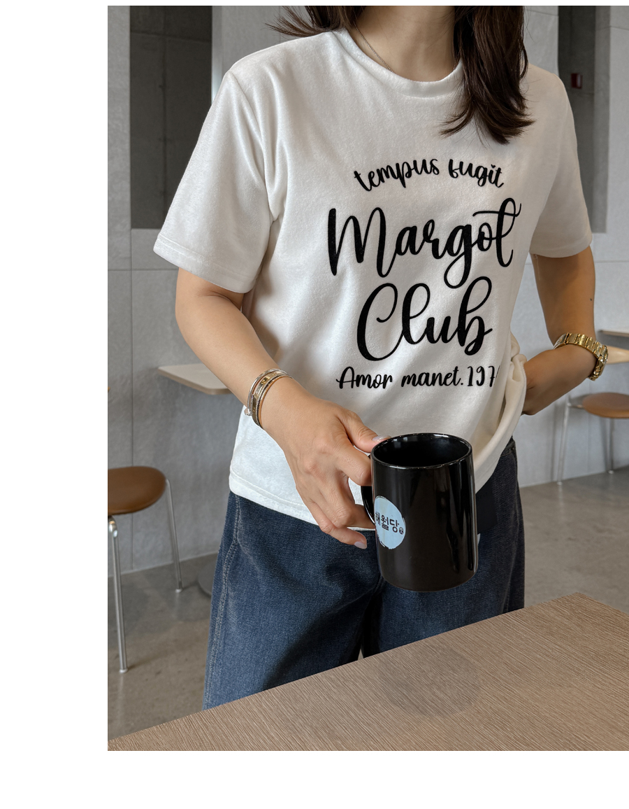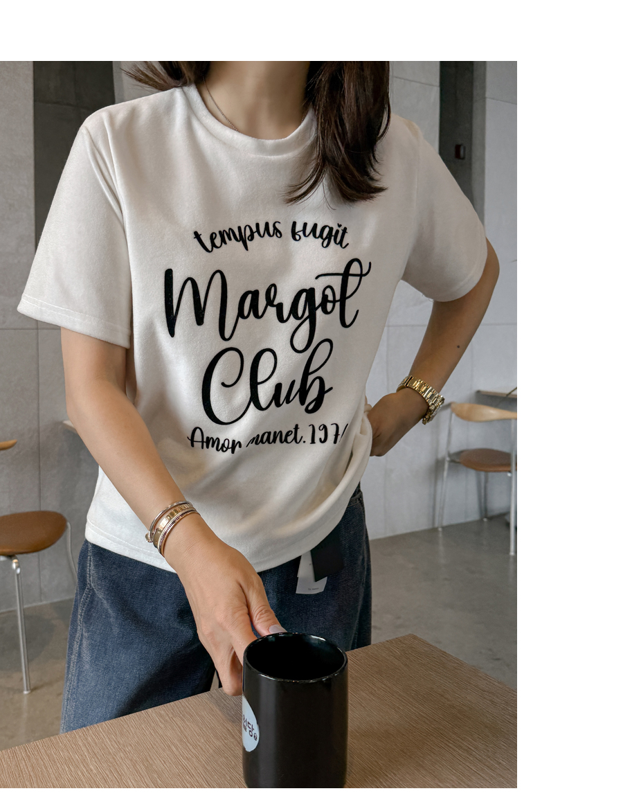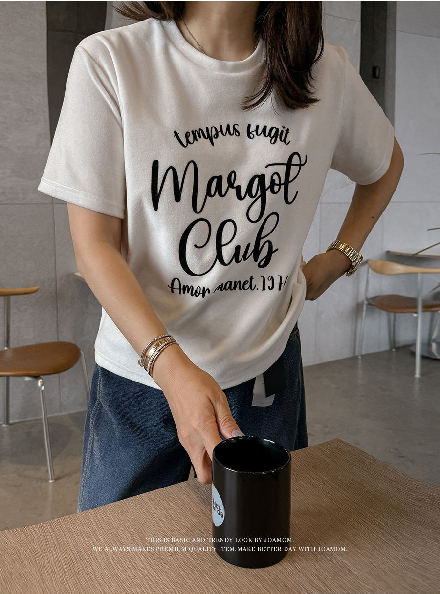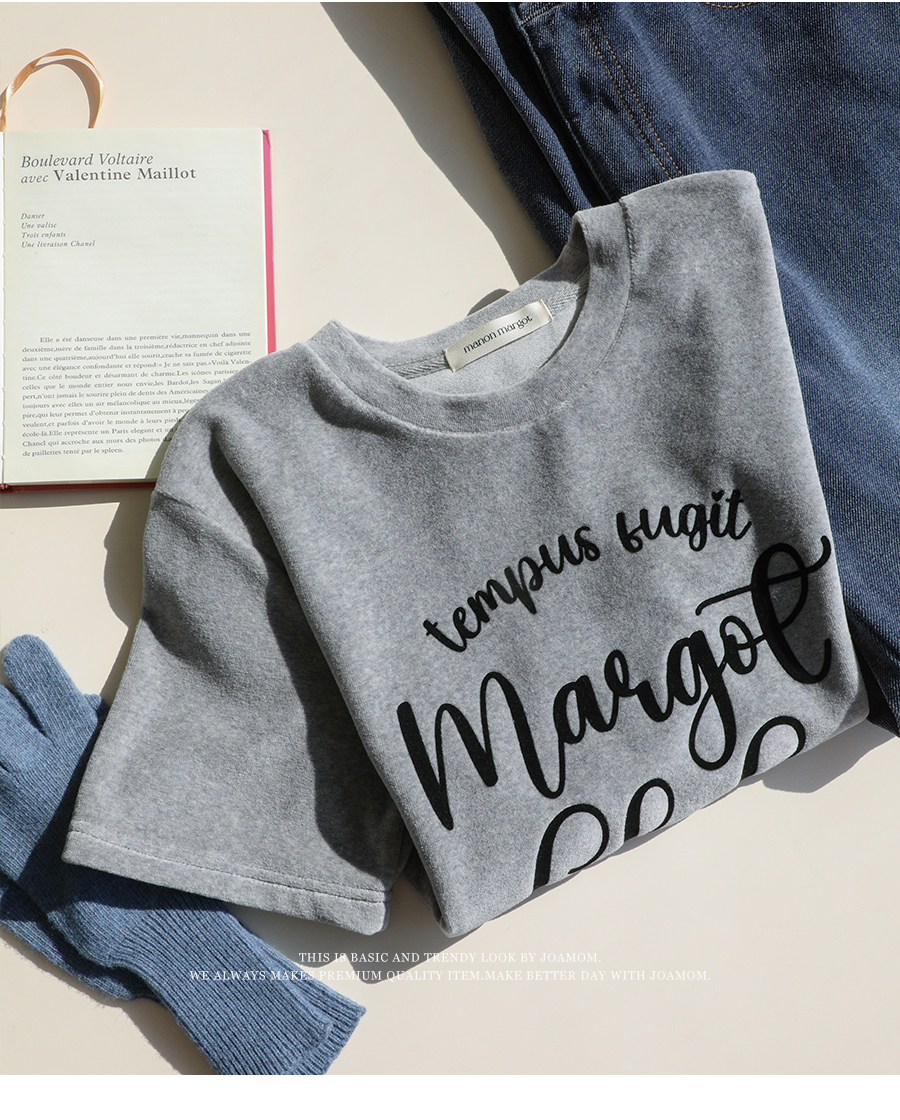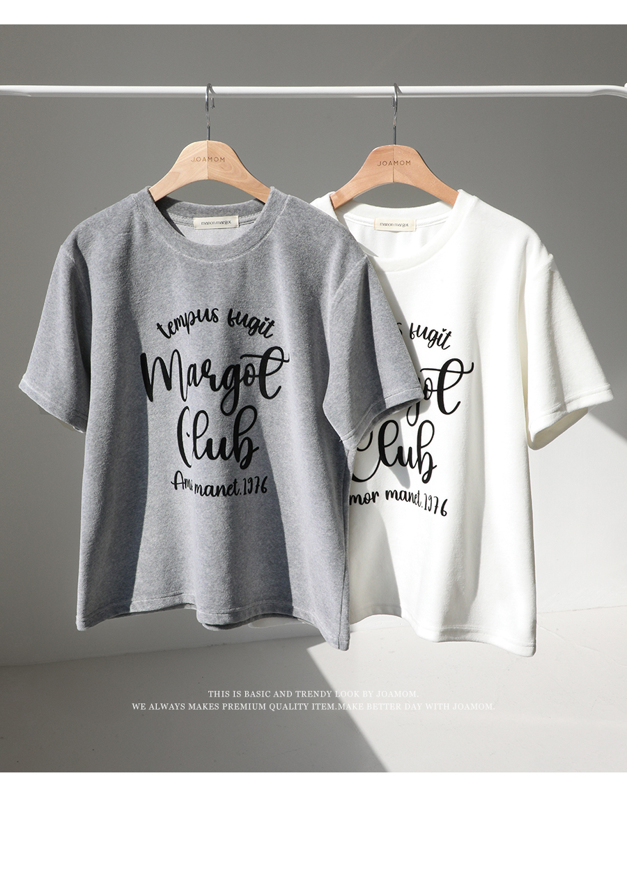 ベルベットの高級感のある素材感とタイポレタリングが出会い、楽にマッチしても雰囲気終わりのジョアマムのティーシャツ! (2color)