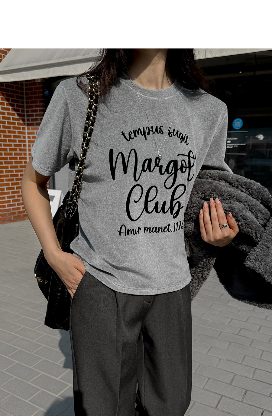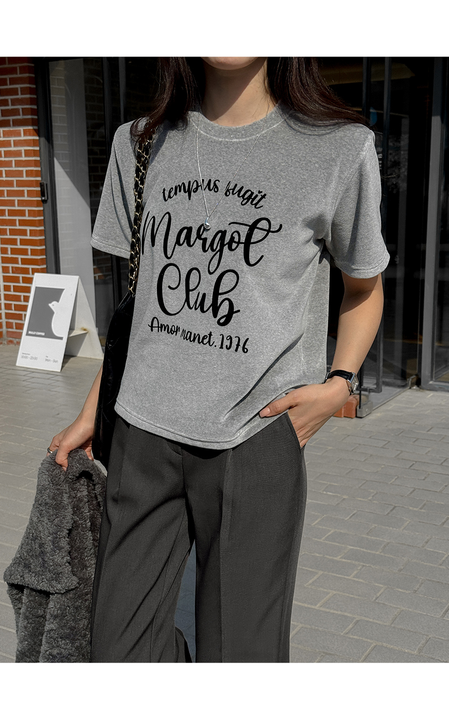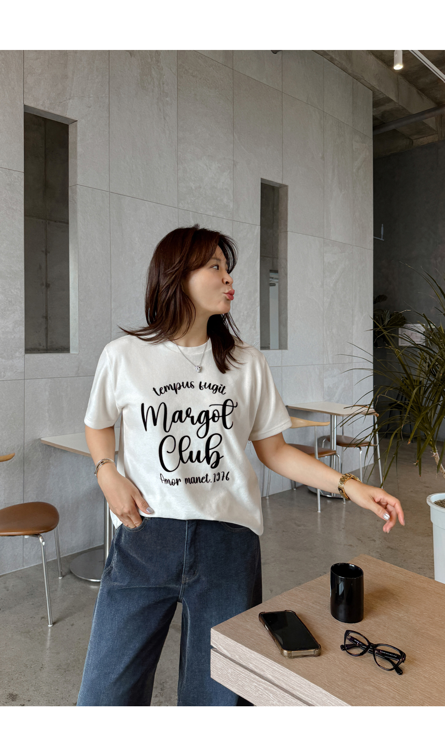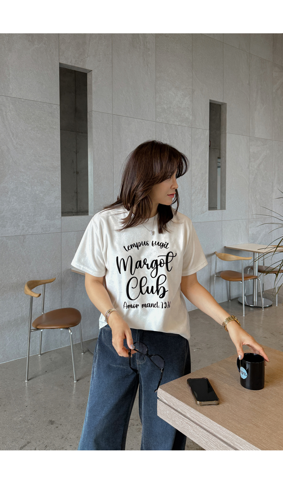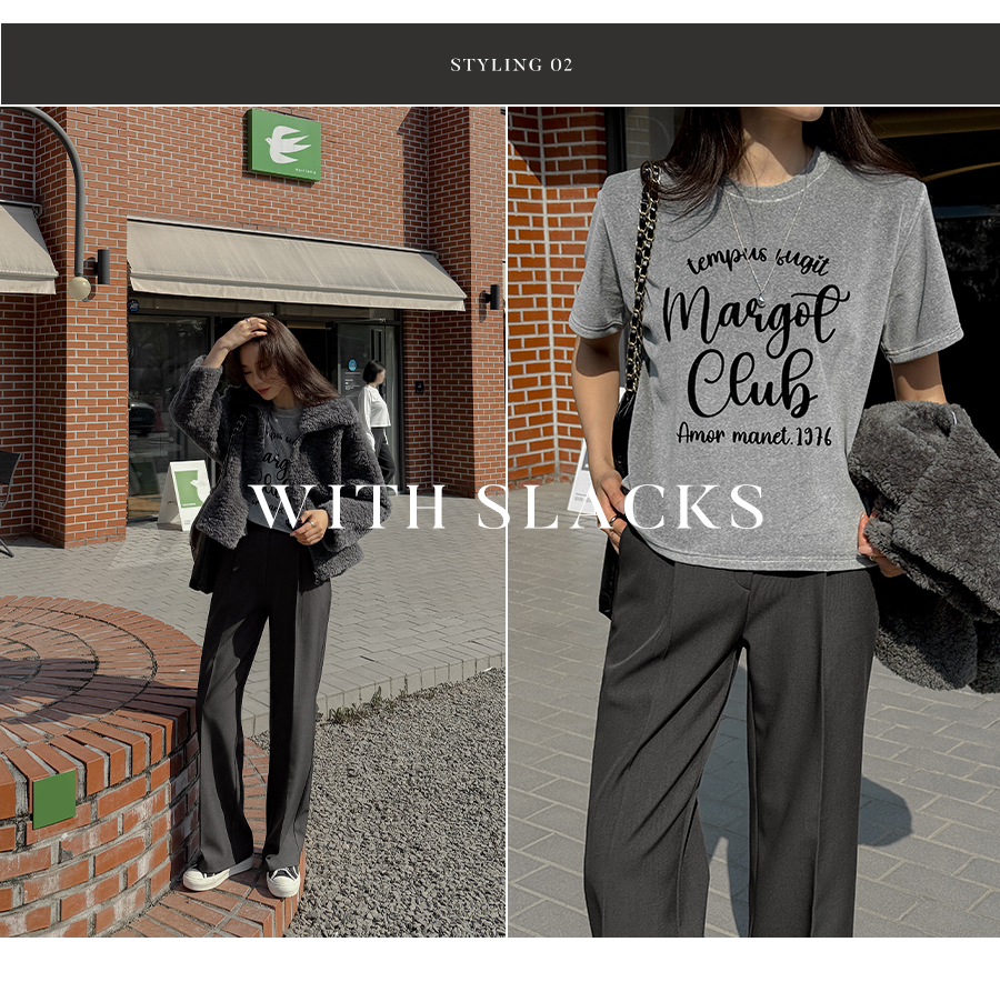 ベルベットの高級感のある素材感とタイポレタリングが出会い、楽にマッチしても雰囲気終わりのジョアマムのティーシャツ! (2color)