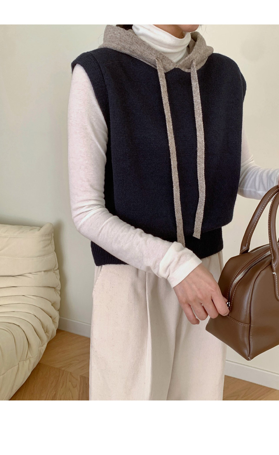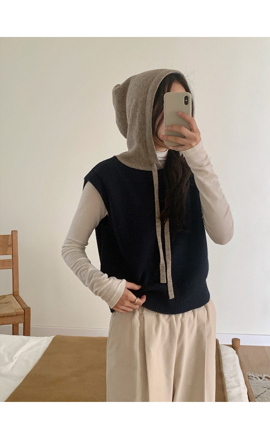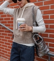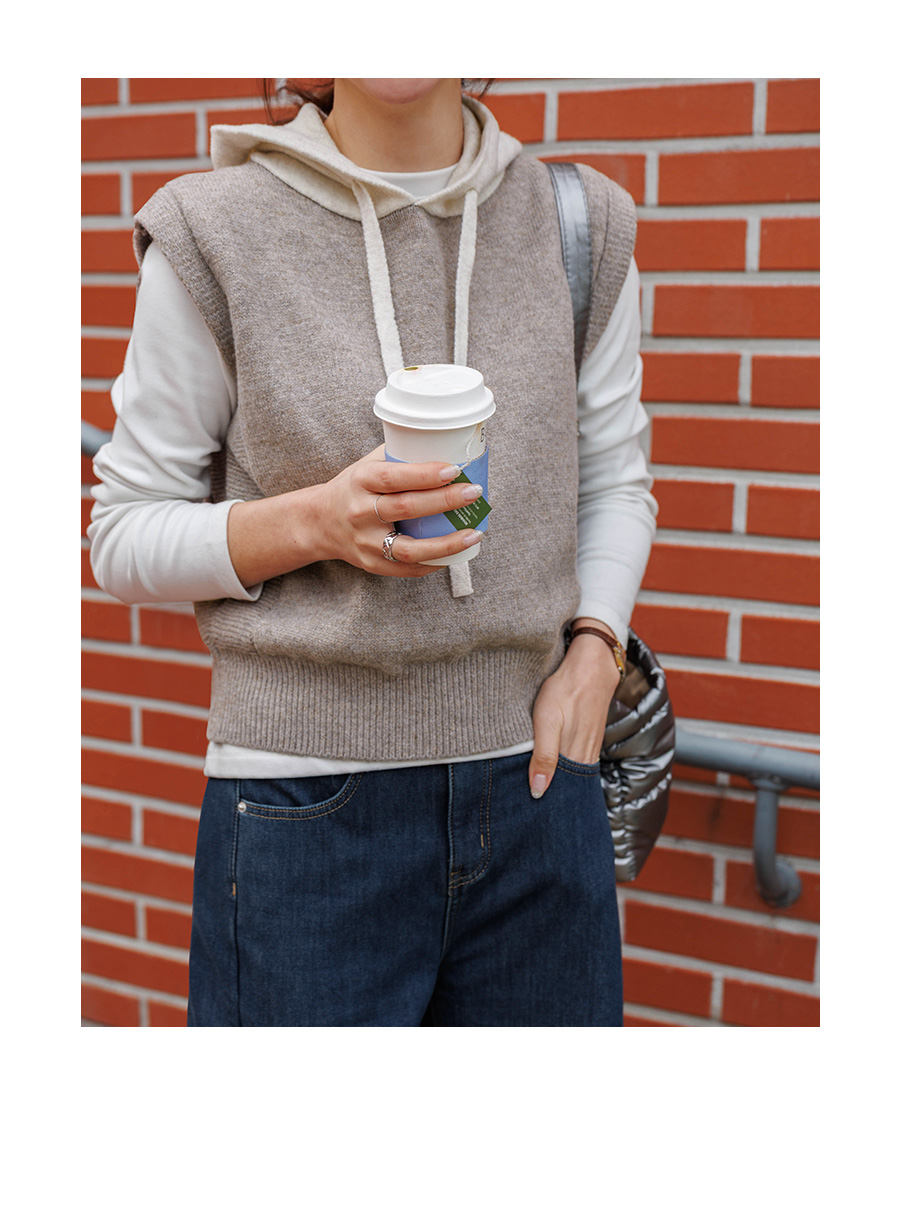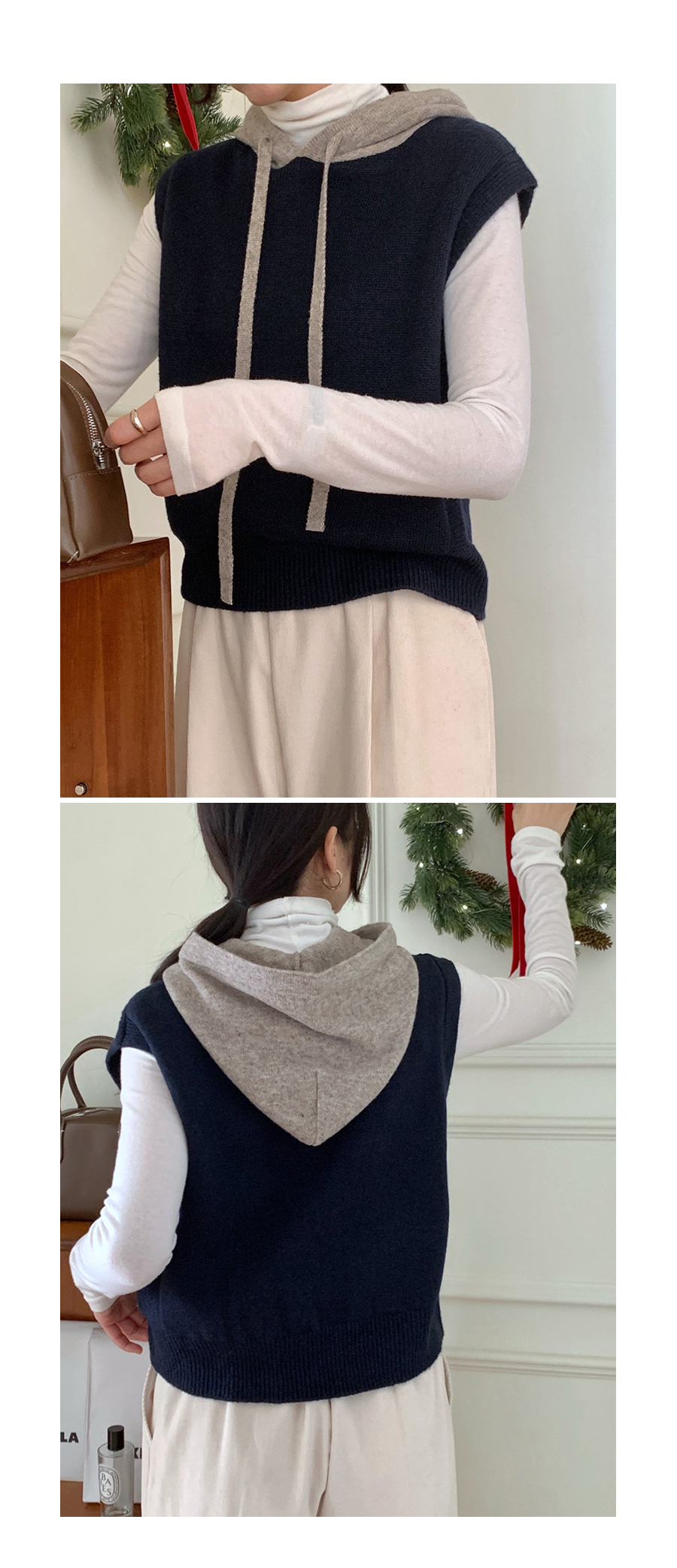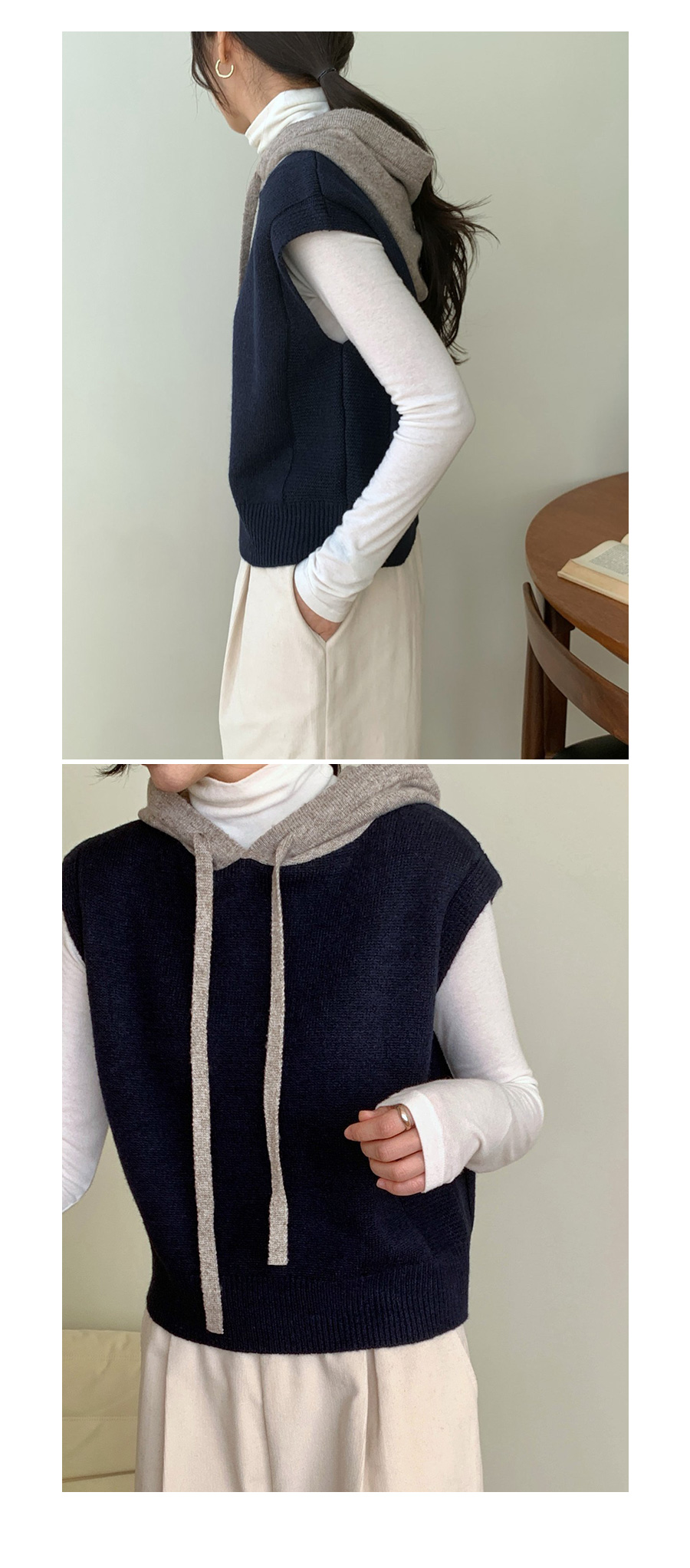 컬러 배색이 있는 후드 니트 조끼에요