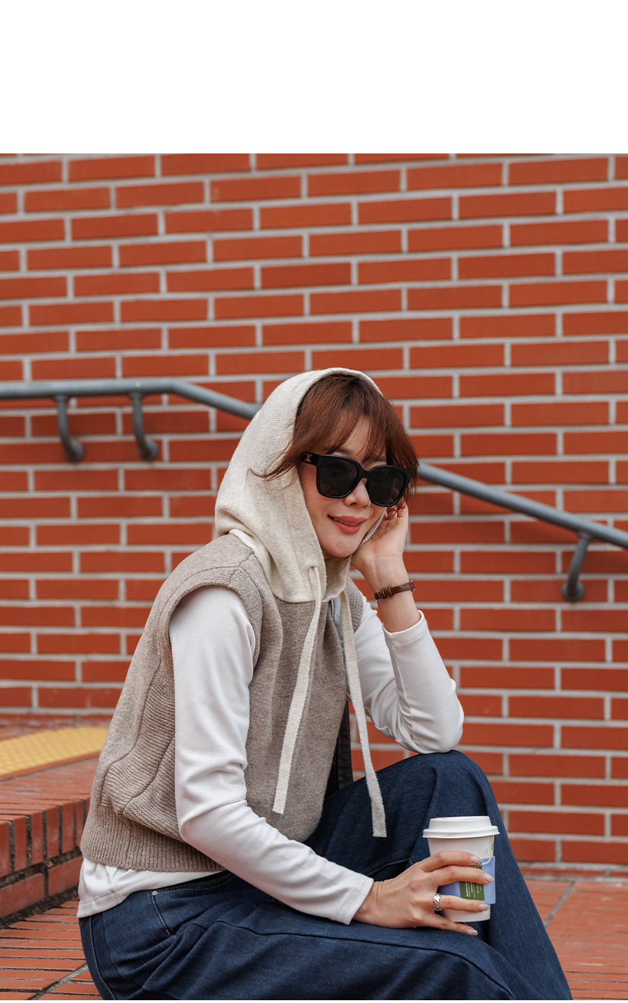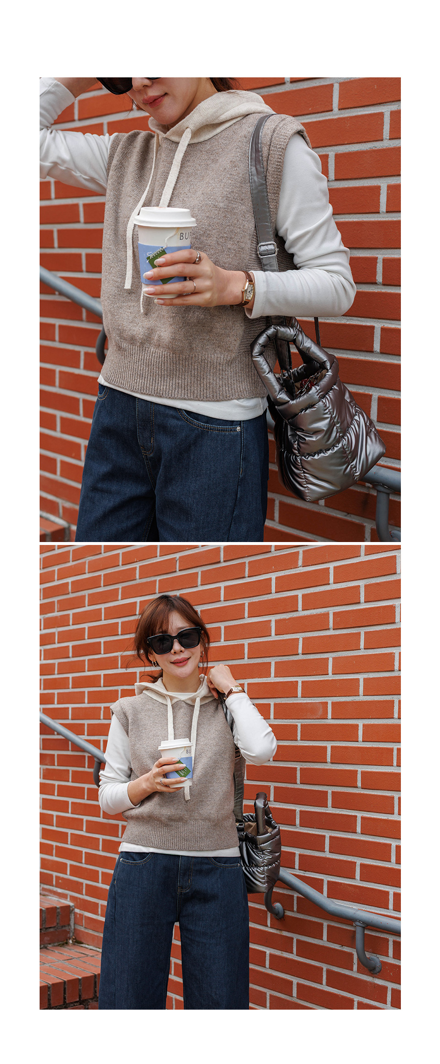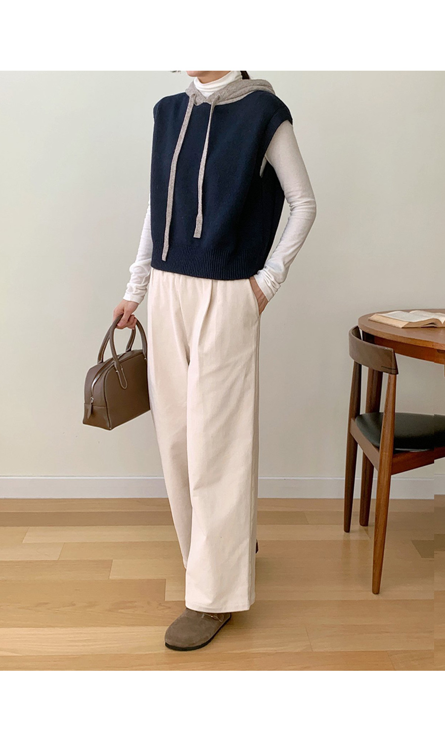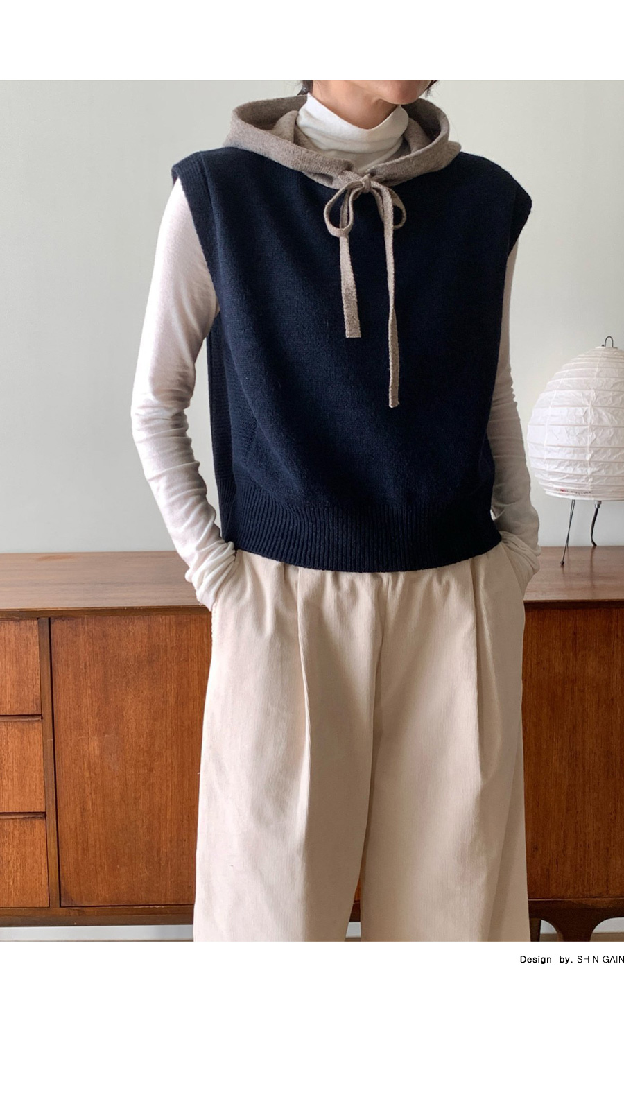 컬러 배색이 있는 후드 니트 조끼에요