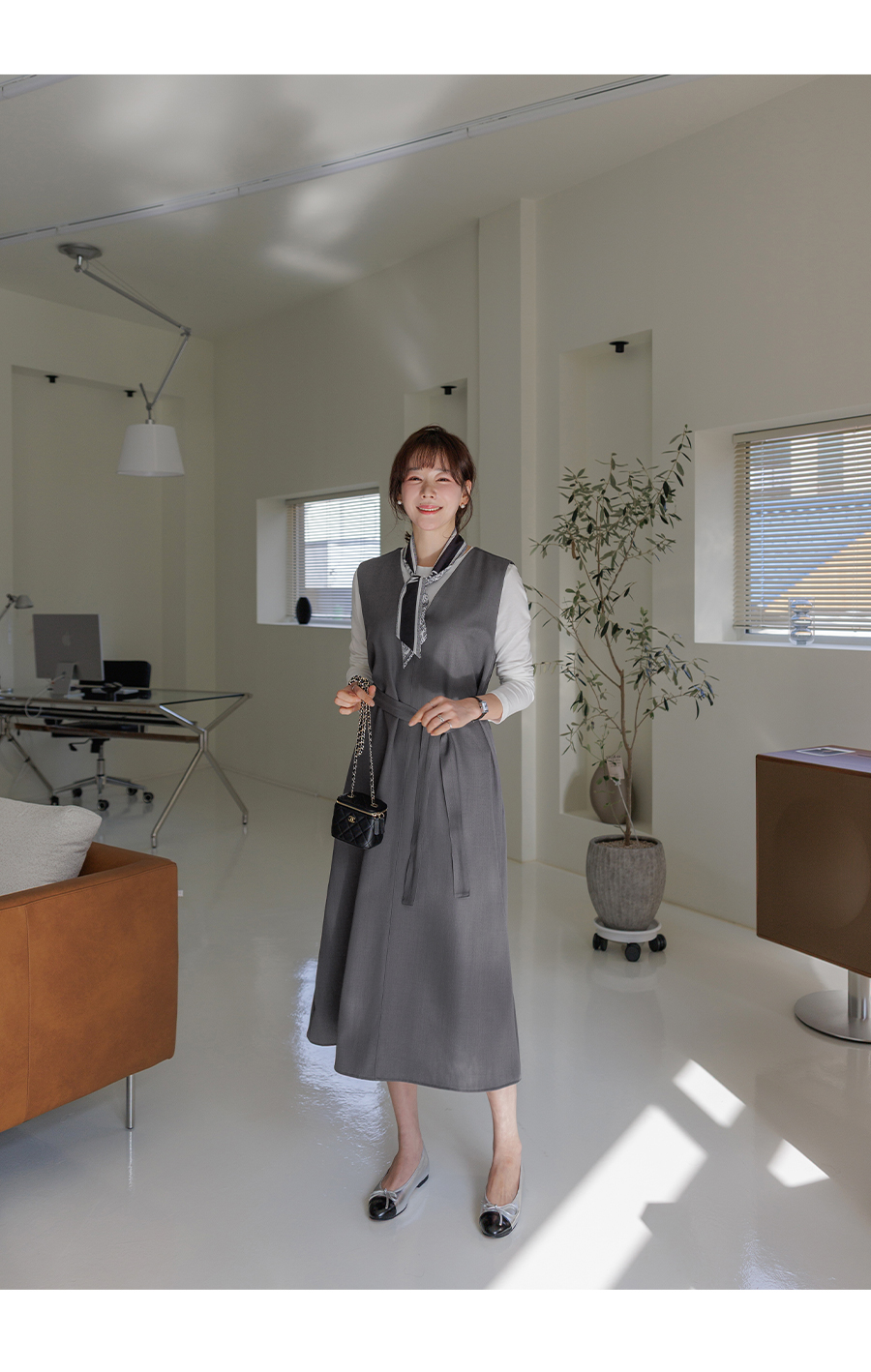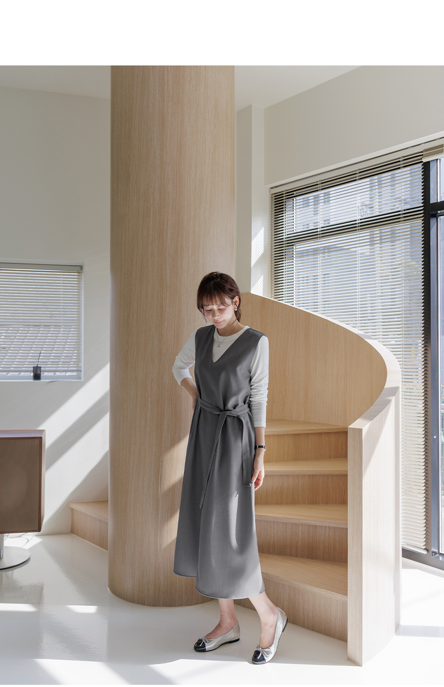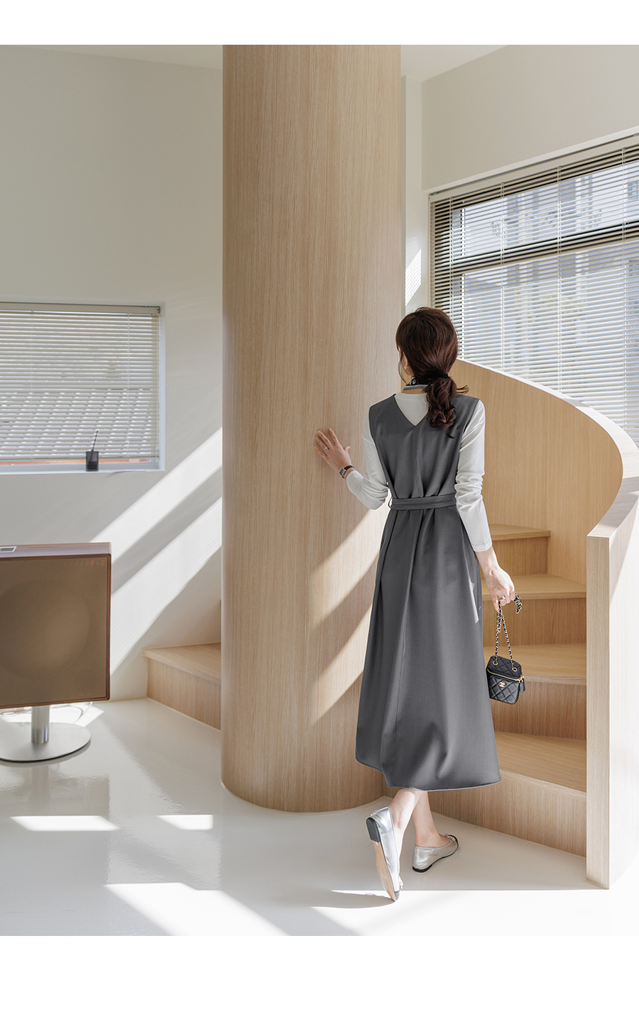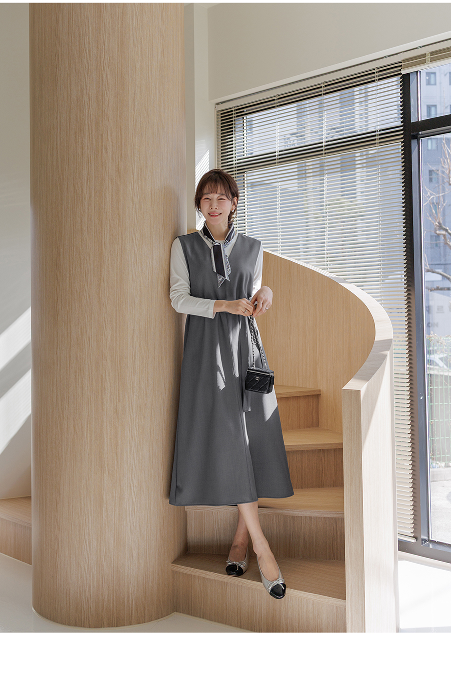 여성스러운 V넥과 플레어 스커트로 클래식한 무드